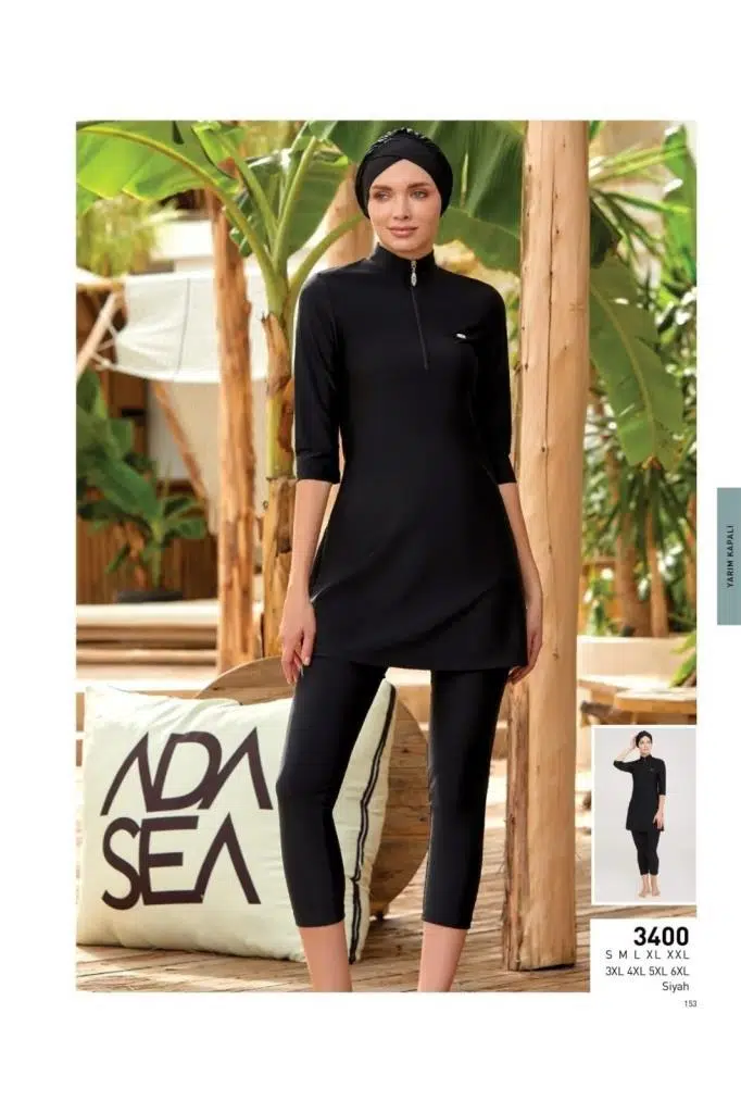 Adasea Anda Battal 3400-Siyah Diresk Kol Fermar Detaylı Yarı Kapalı Battal Tesettür Mayo