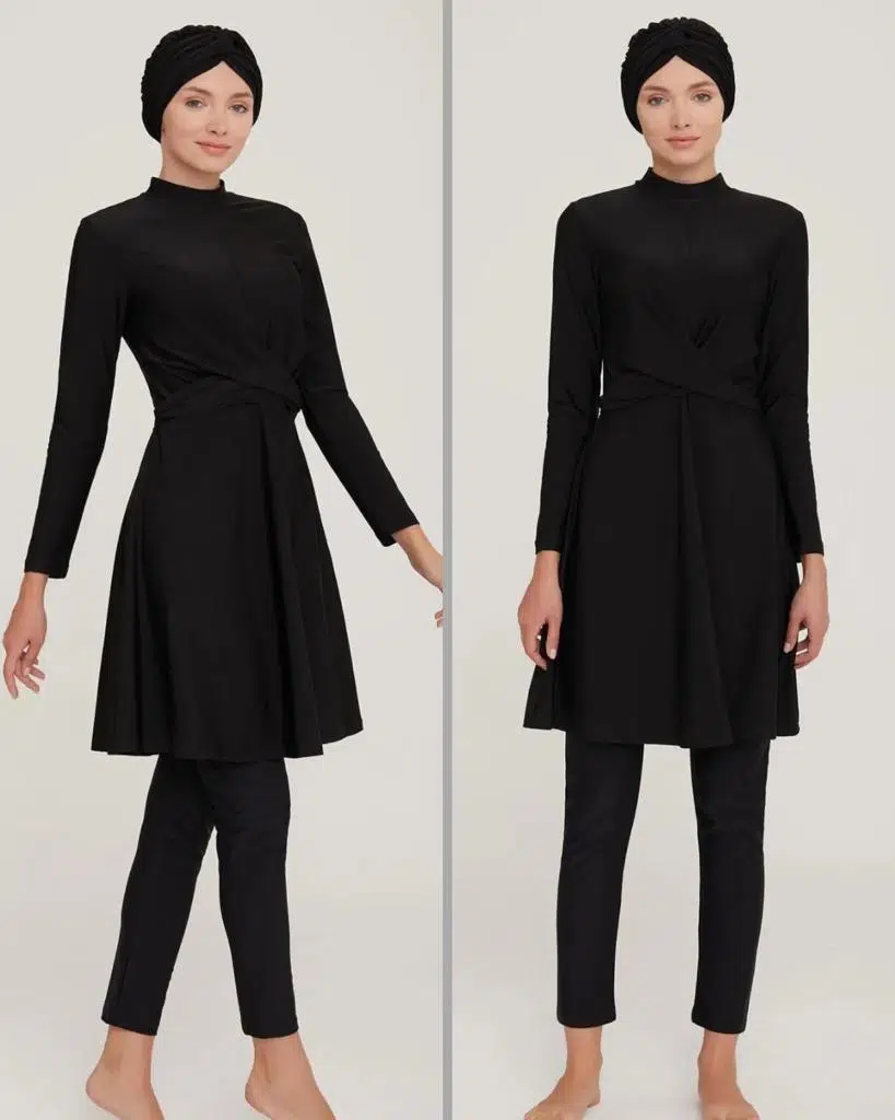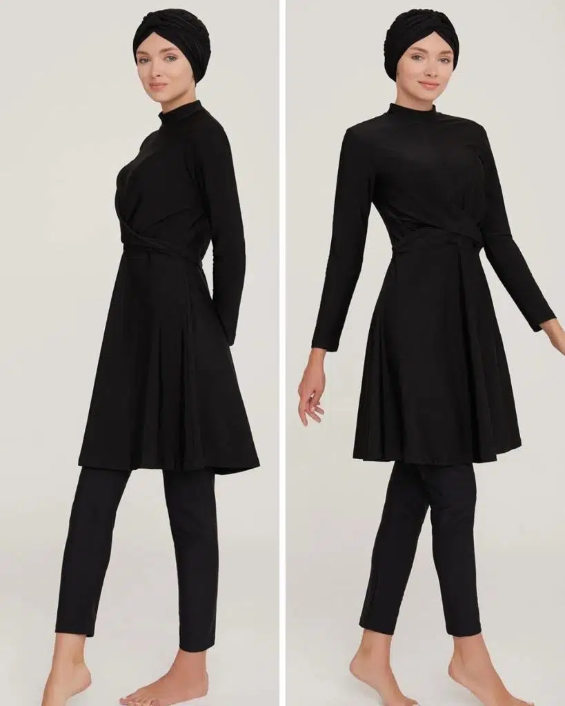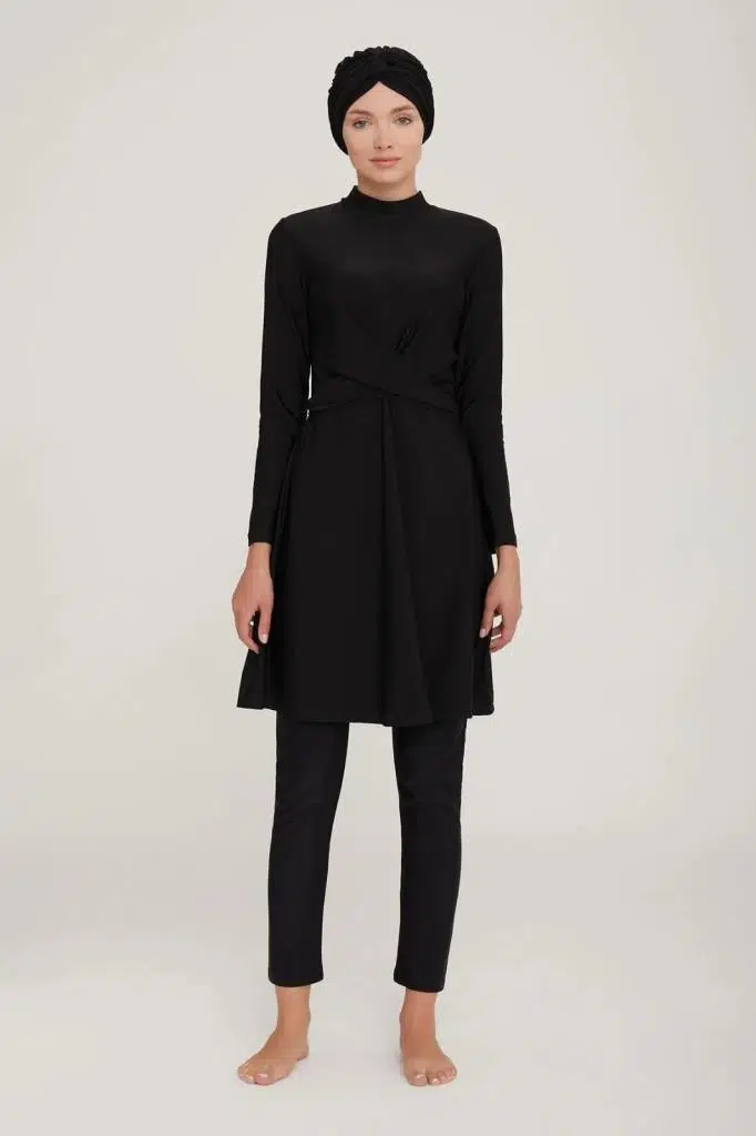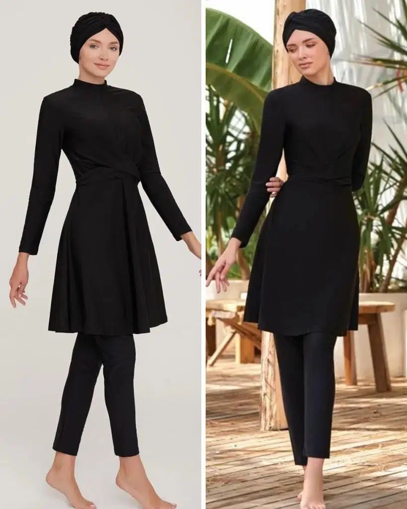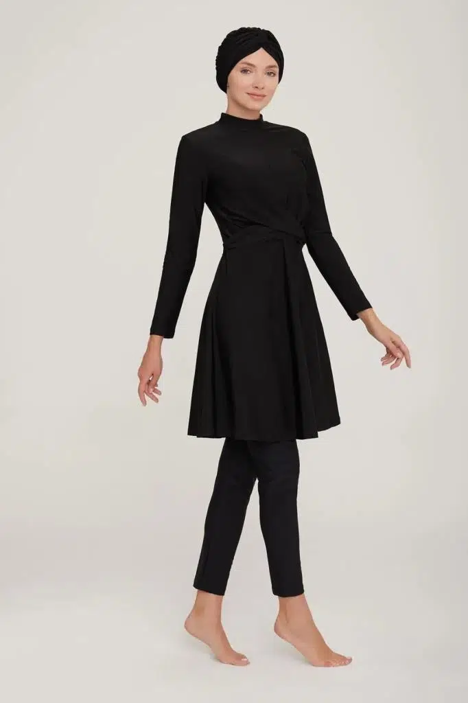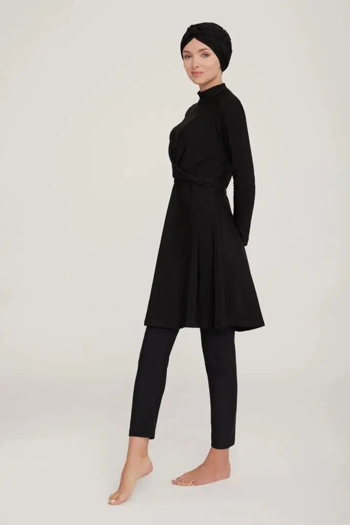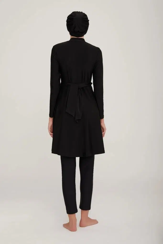DÜZ SİYAH KUŞAKLI TESETTÜR MAYOMUZ İTHAL POLYAMİD MAYO KUMAŞINDAN ÖZEL ÜRETİLMİŞTİR.