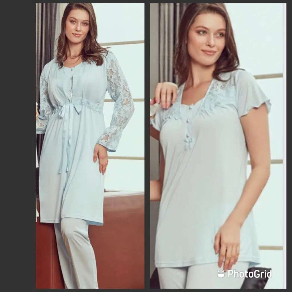 Bone Club 4902 MAVİ Hamile Lohusa 3 Lü Dantel Kollu Pijama Sabahlık