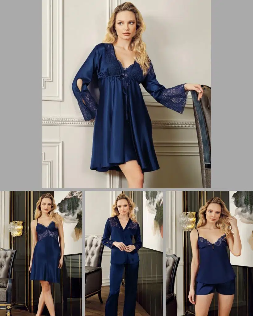 LOWELA PARİS 2005 Lacivert Saten Kısa Gecelikli 6 Lı Çeyiz Seti