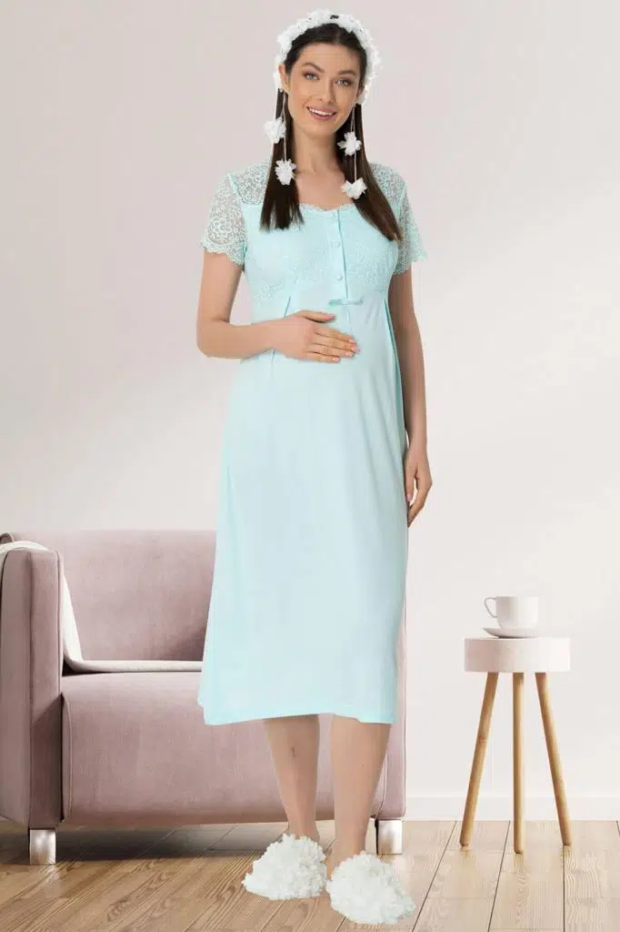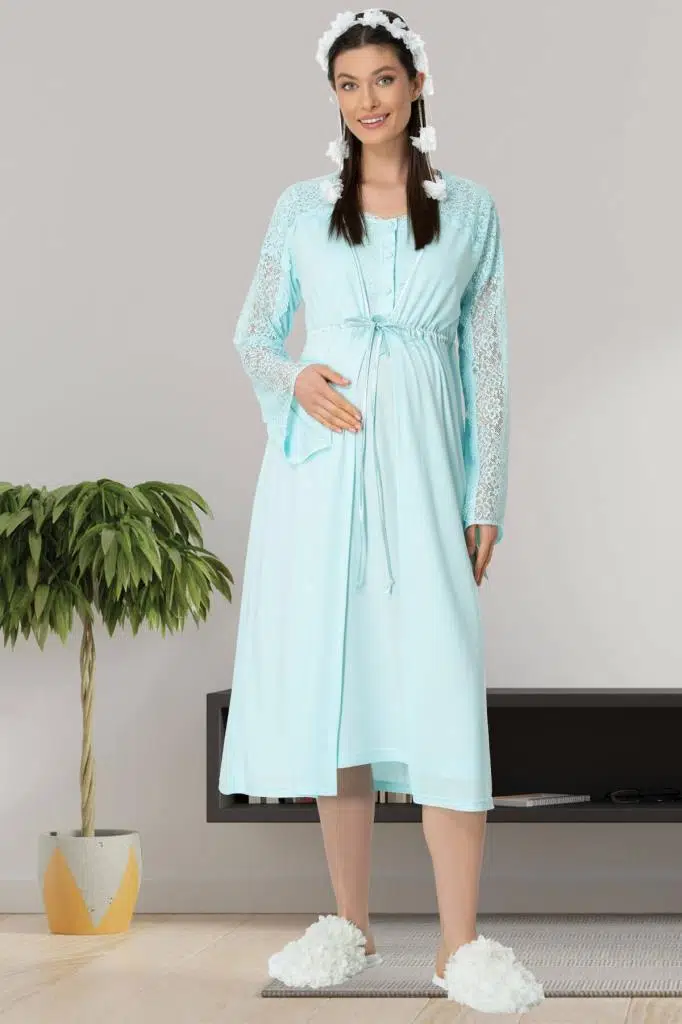 Mecit 5439 TURKUAZ Dantelli Sabahlıklı Lohusa Gecelik Takımı