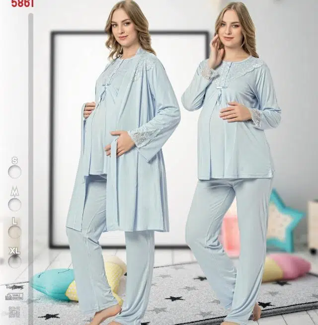 NEHİR 2020 MAVİ Hamile Lohusa Pijama Sabahlık 3Lü Takım