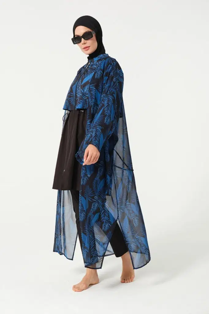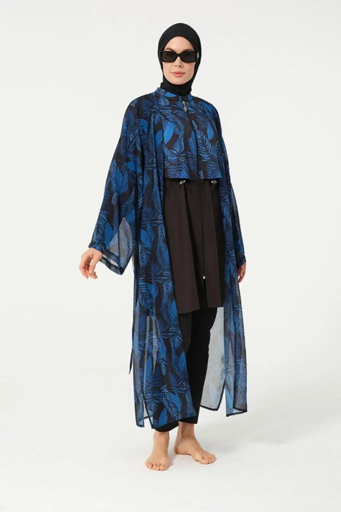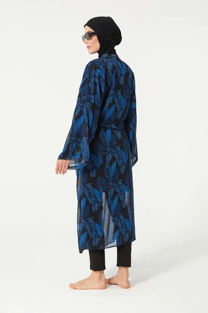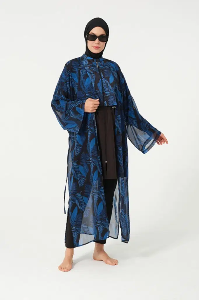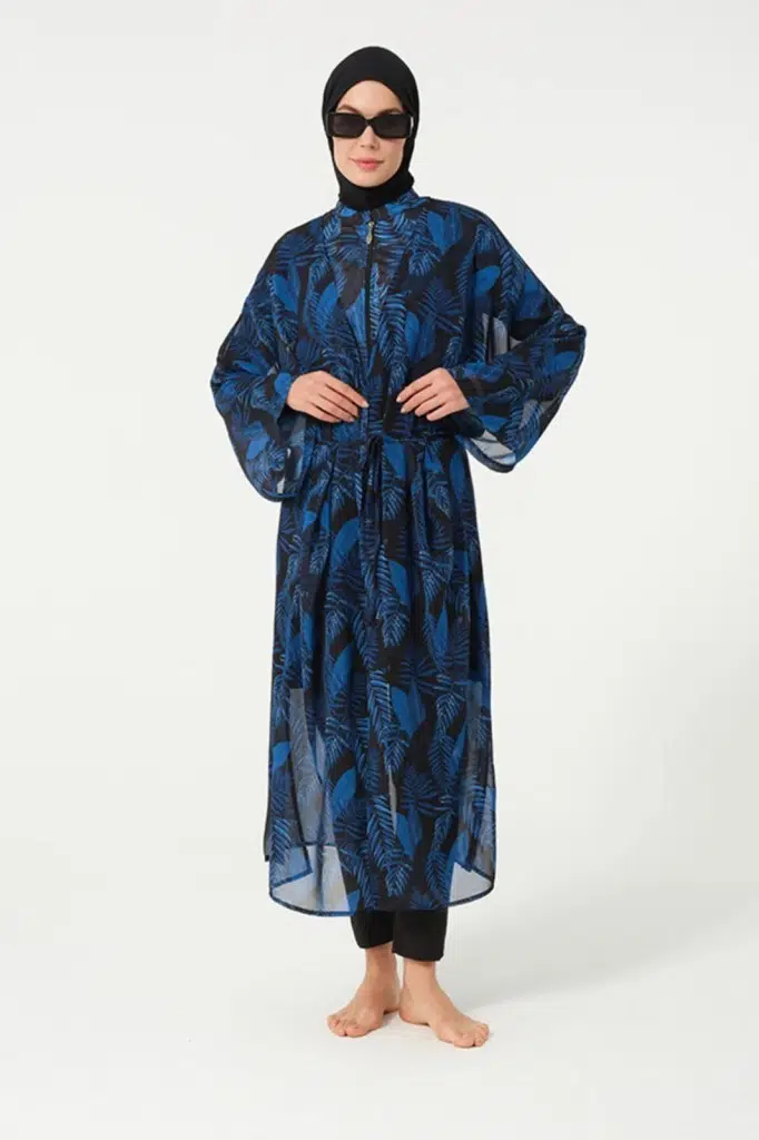 Tesmay 2004 Lacivert Yapraklı Pareo Tesettür Mayo Üzerine Kaftan