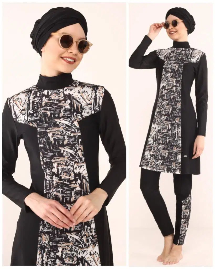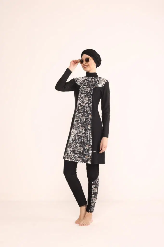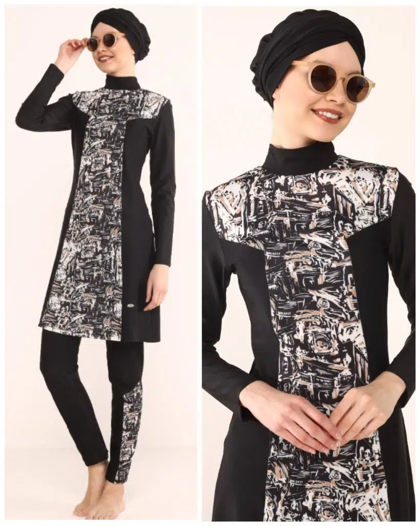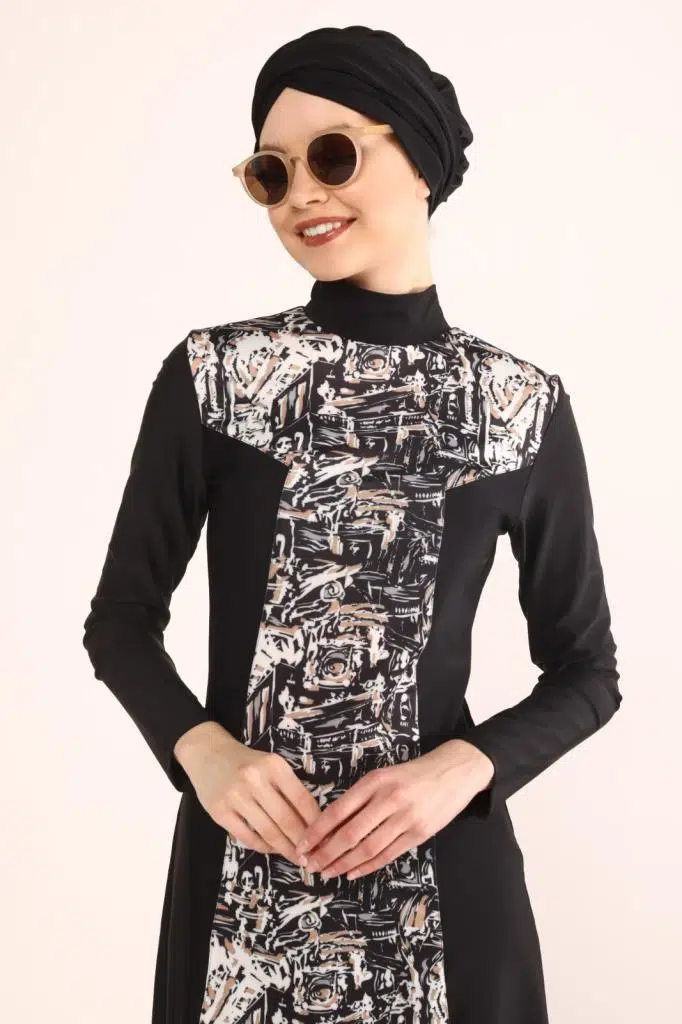 TESMAY 2242 Siyah Dijital Desenli Lycralı Tesettür Mayo