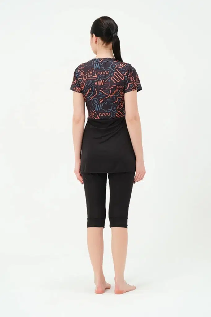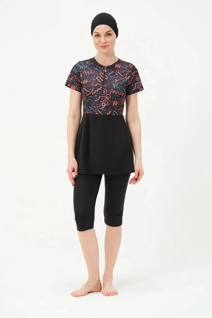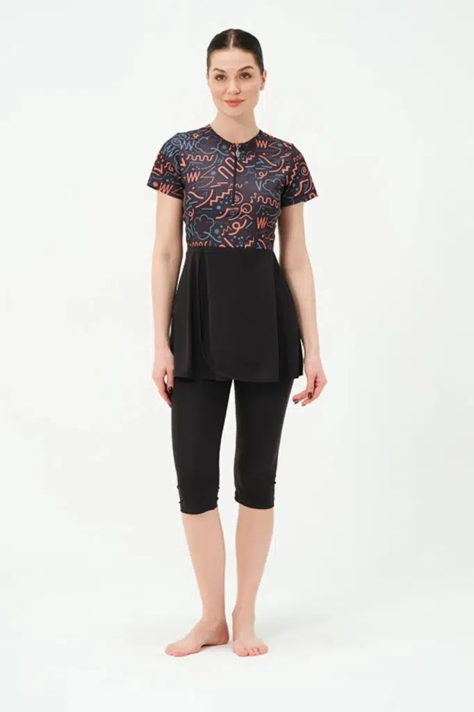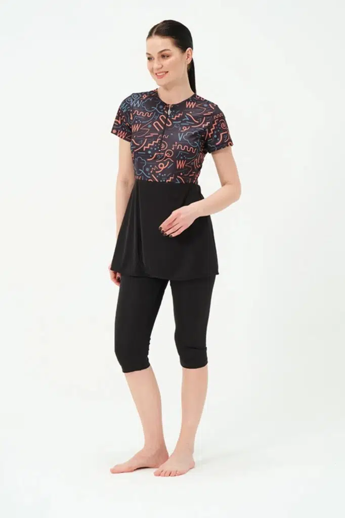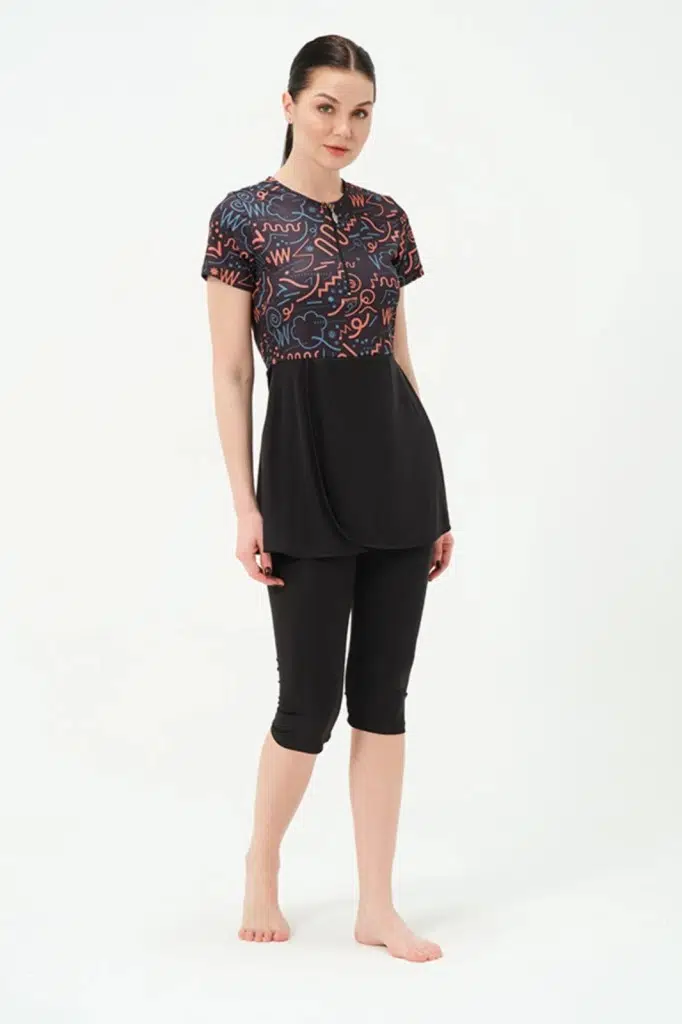 Tesmay 2312 Siyah Turuncu Lycralı Yarı Kapalı Havuz Mayo