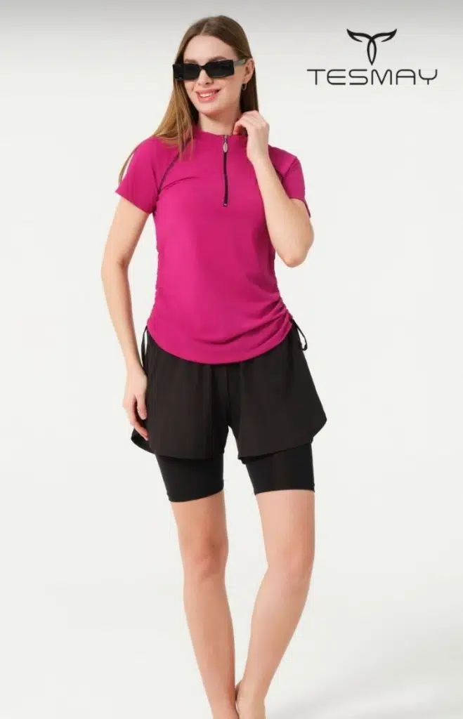 Tesmay 24156 Fuşya Kısa Kol Yarım Fermuarlı Hızlı Kuruyan Kumaş Şortlu Taytlı Yarı Kapalı Mayo