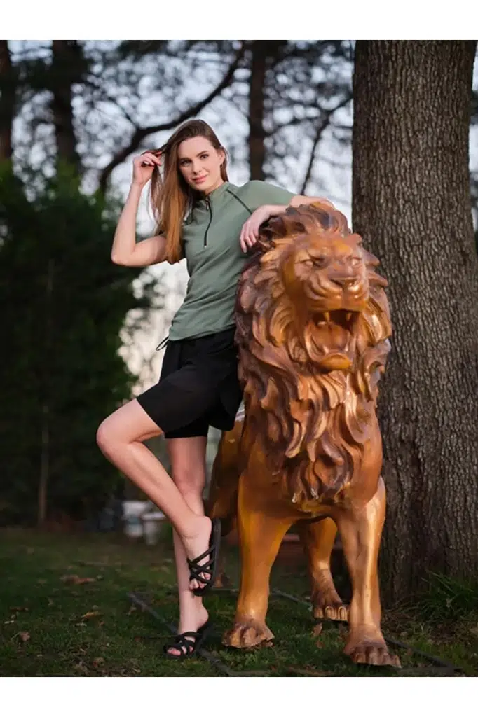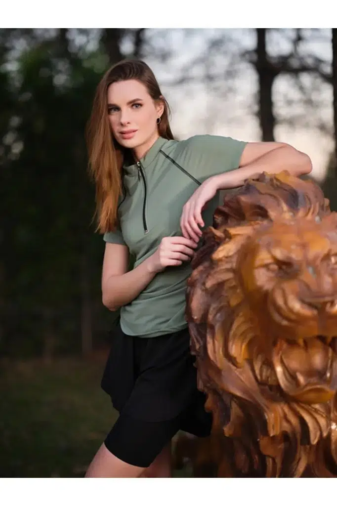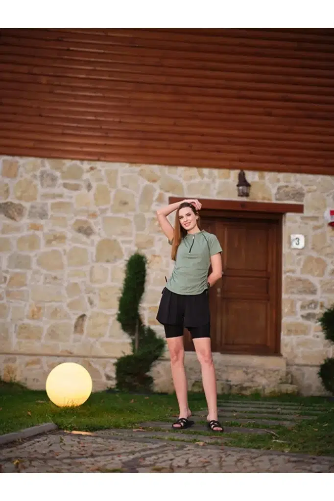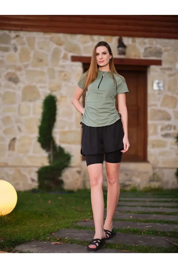 Tesmay 24156 Yeşil Kısa Kol Yarım Fermuarlı Hızlı Kuruyan Kumaş Şortlu Taytlı Yarı Kapalı Mayo