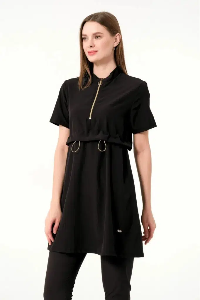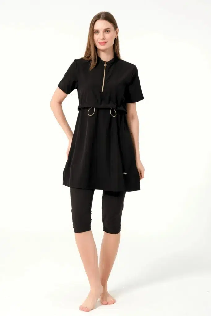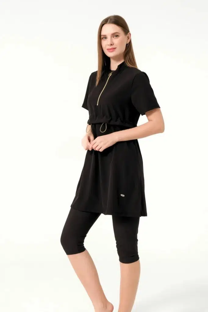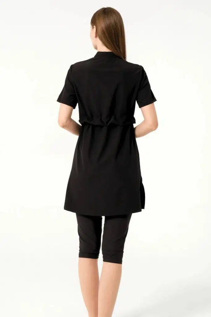 Tesmay 3410 Siyah SporLycra Üstlü Hızla Kuruyan Kısa Kollu Yarı Tesettür Havuz Mayo